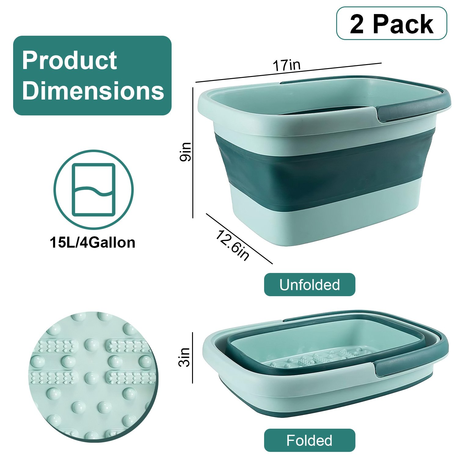 2 Pack Collapsible Foot Bath Basin 15L/4Gallon Foot Soak Tub Multifunctional Foot Bucket with Handle 8 Massage Rollers 54 SPA Bumps